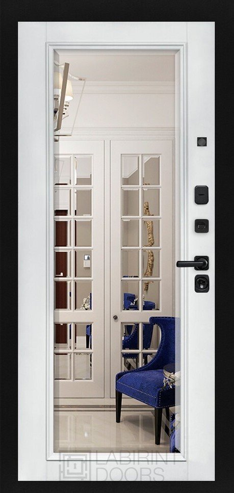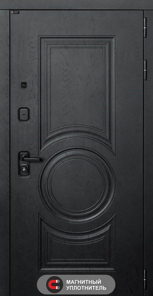 Фурнитура в черном цвете: Броненакладка врезная, накладка со шторкой, глазок , дверная ручка, ночная задвижка. Цилиндр ключ-вертушка Apecs, регулируемый эксцентрик.